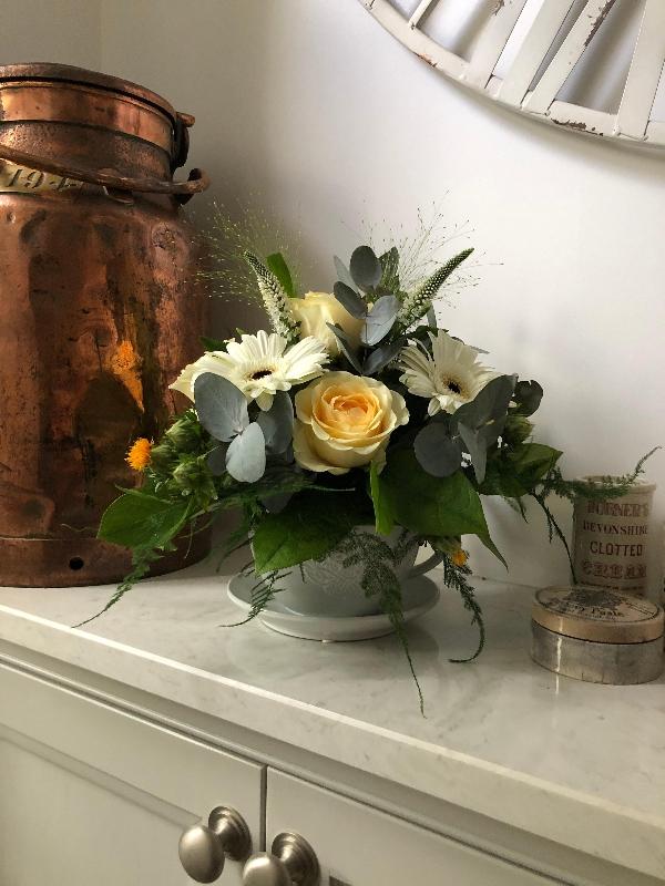 A beautiful arrangement of flowers, set within a ceramic teacup container. In a soft pastel colour palette. A pretty petite ready arranged gift, perfect for Mums.