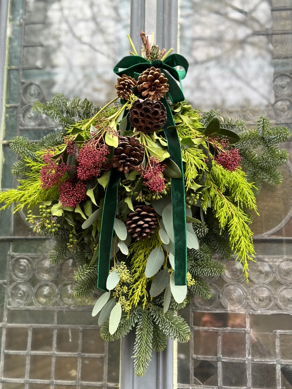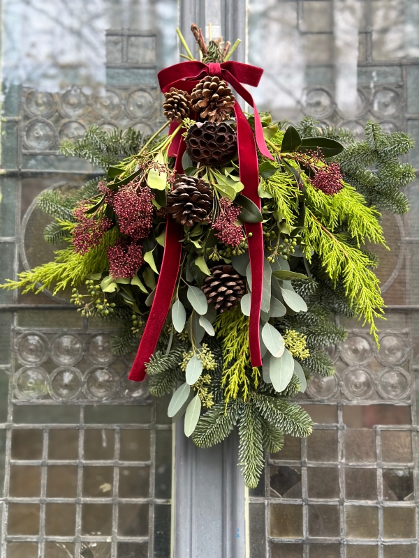 The swag will be finished with a luxurious velvet ribbon, available in a choice of colours as pictured .... burgundy, dark green, bright red or sage green.