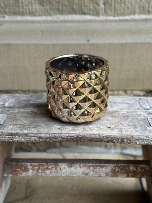 A rounded festive arrangement of seasonal flowers and foliages arranged in a shimmery reflective gold container. This is an ideal festive gift or for yourself for your own home at Christmas time.
