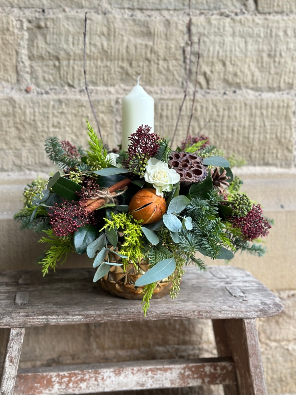Made with a selection of long lasting foliages, fresh flowers and cones, oranges and cinnamon sticks.